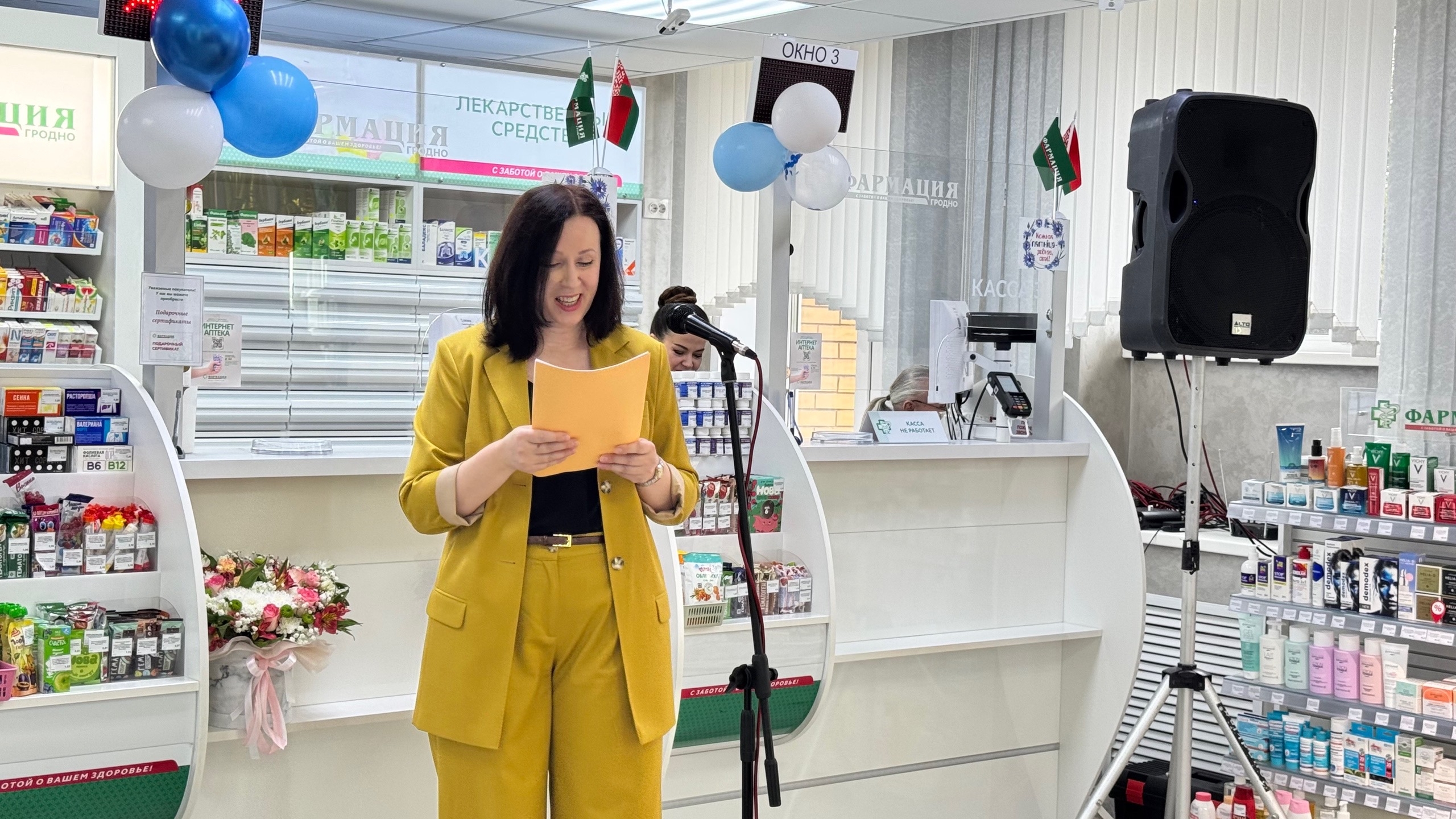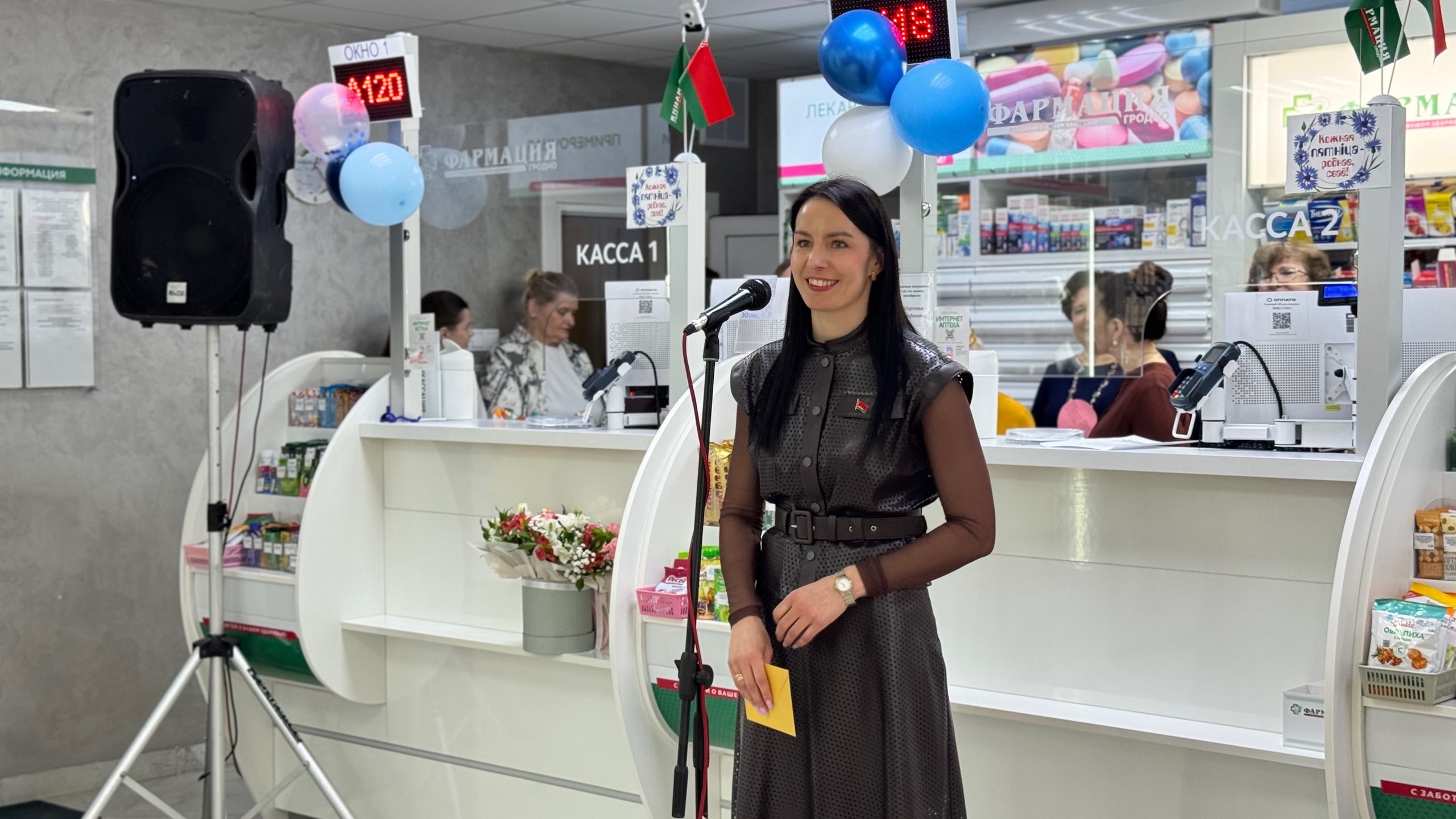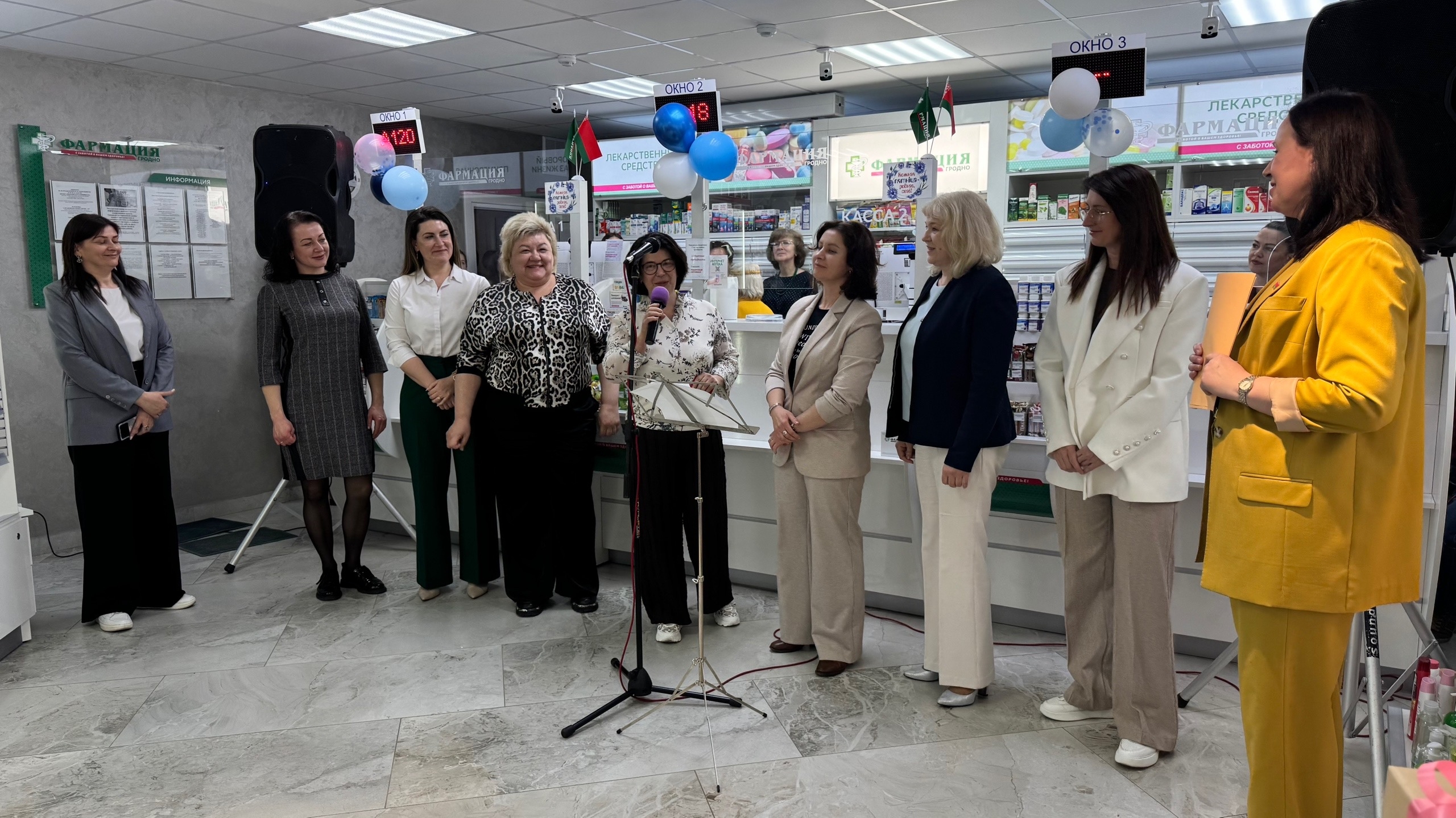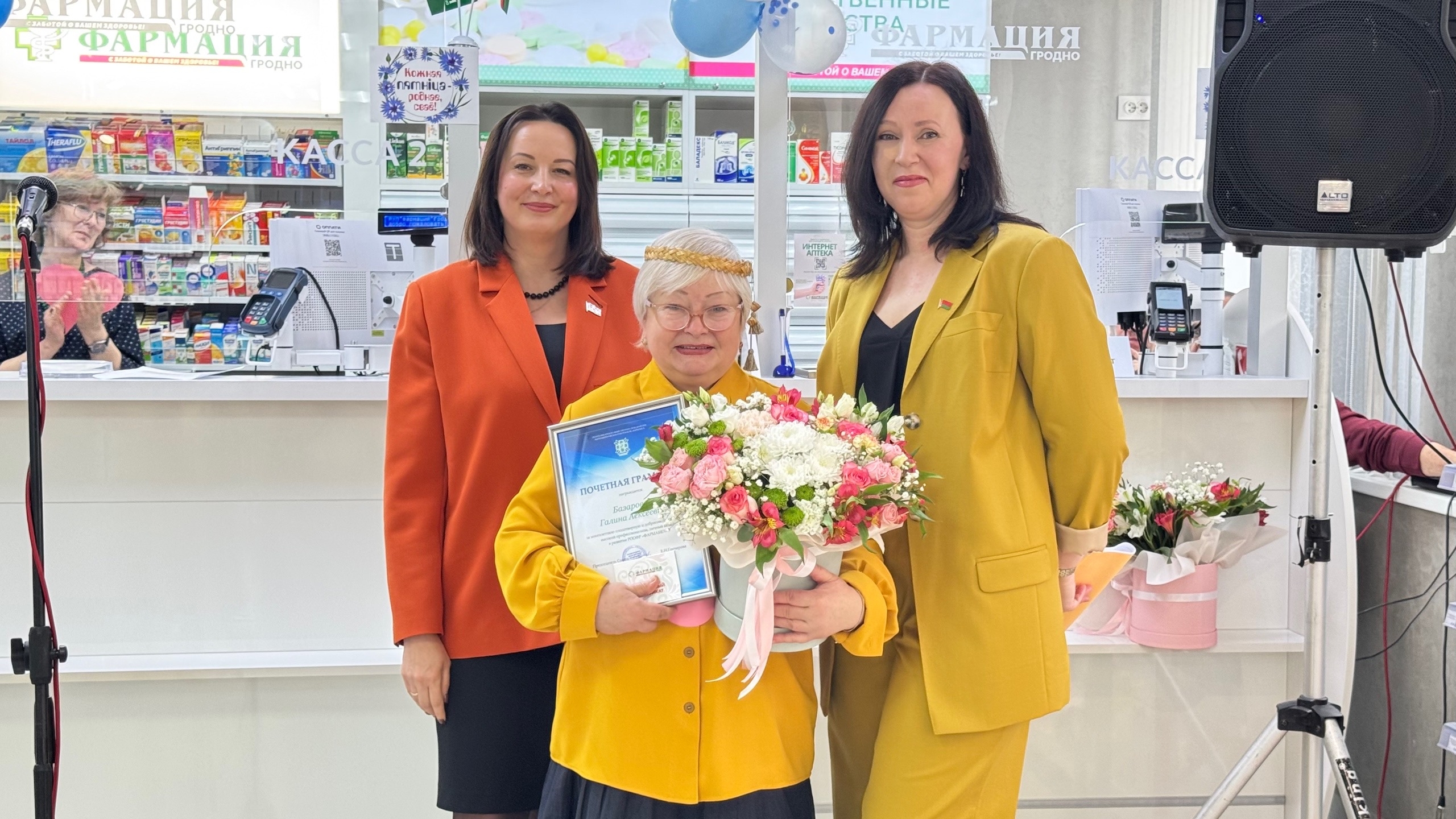 Первой коллектив аптеки поздравила генеральный директор Гродненского РУП "Фармация" Татьяна Зарецкая, депутат Гродненского городского Совета депутатов, а так же вручила награды от РООФР "ФАРМАБЕЛ". Затем председатель Первичной профсоюзной организации Гродненского РУП "Фармация" Екатерина Зеневич.